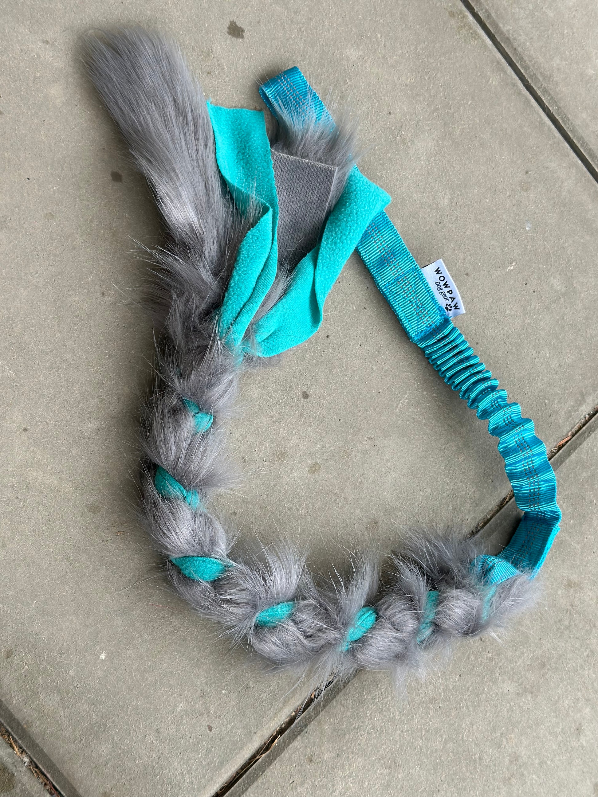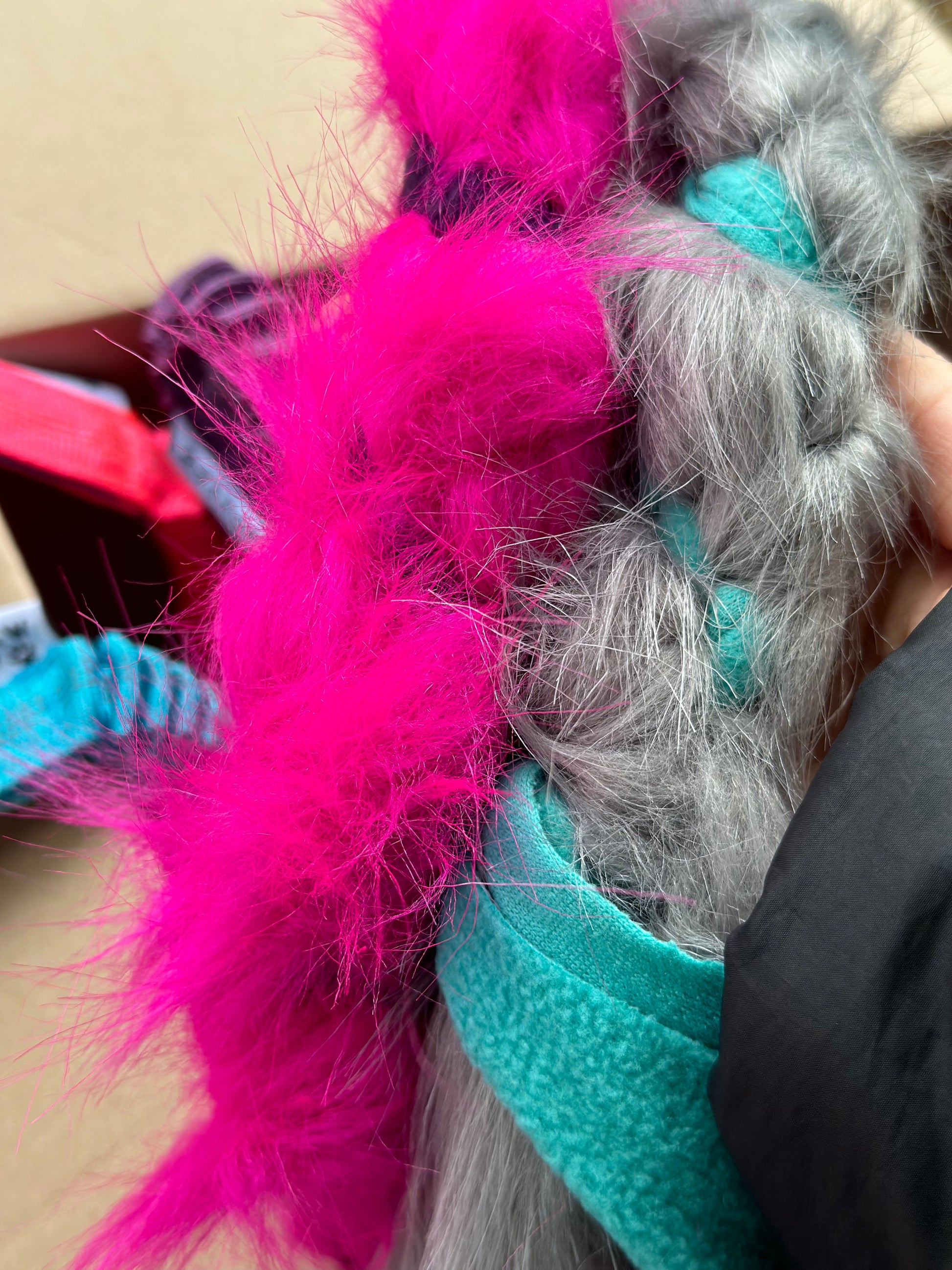 Sztuczne futro Zergel plecione w kolorze różowym i niebieskim z paskiem bungee na nadgarstku.